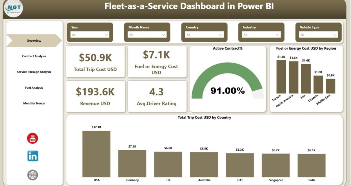 A Fleet-as-a-Service Dashboard in Power BI is an interactive analytics dashboard designed to monitor and analyze fleet operations in real time.