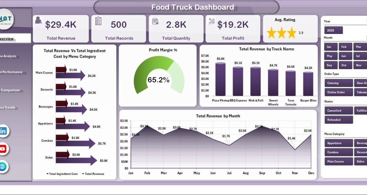 Managing a food truck business involves tracking sales across multiple trucks, locations, menu items, and time periods. Our Food Truck Dashboard in Excel simplifies this by bringing all your critical metrics into one interactive, pivot-driven workbook. Whether you run a single truck or a fleet, this dashboard gives you the insights to optimize operations, boost profitability, and delight customers.