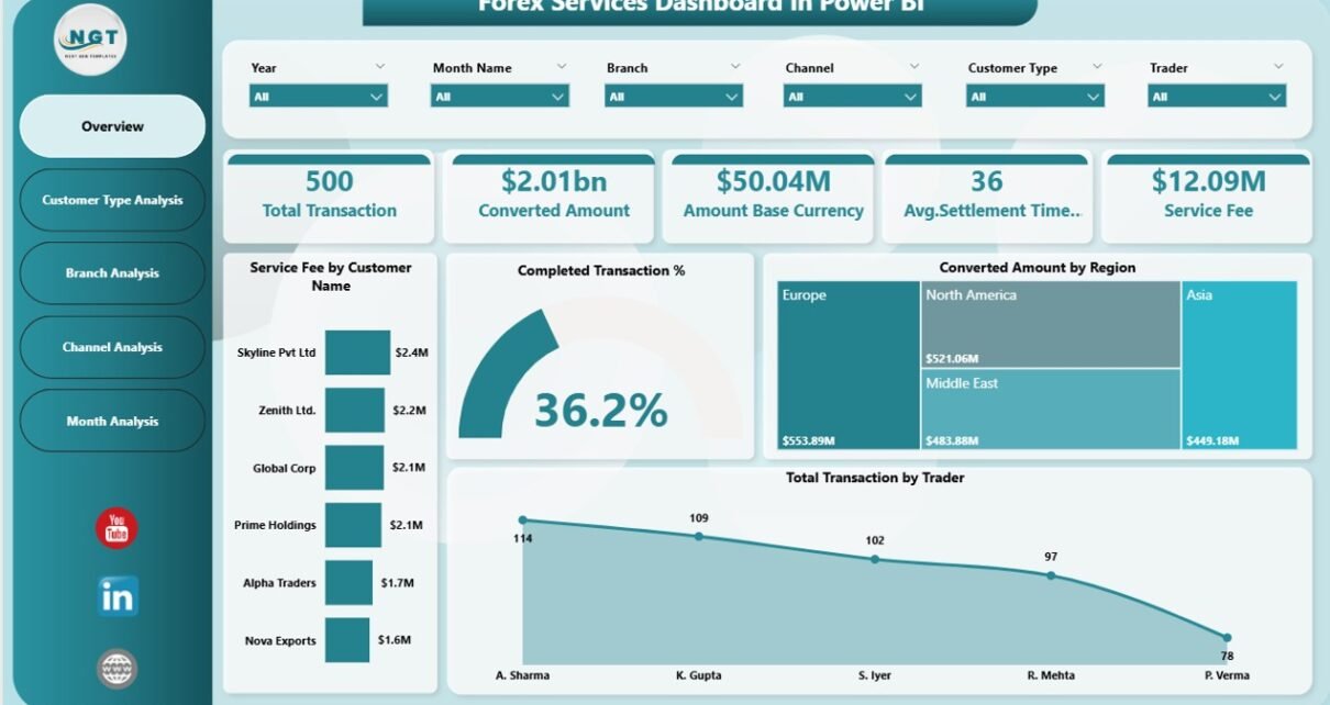 A Forex Services Dashboard in Power BI is an interactive reporting solution designed to track, analyze, and optimize foreign exchange operations using Key Performance Indicators (KPIs) and visual analytics.