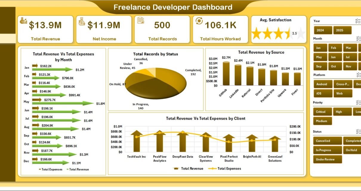 The Freelance Developer Dashboard in Excel tracks 5 headline KPIs: Total Revenue, Net Income, Total Records, Total Hours Worked, and Avg. Satisfaction. All KPI cards recalculate when slicers are applied, so you can filter the entire dashboard to a single client, status, or technology stack in two clicks.