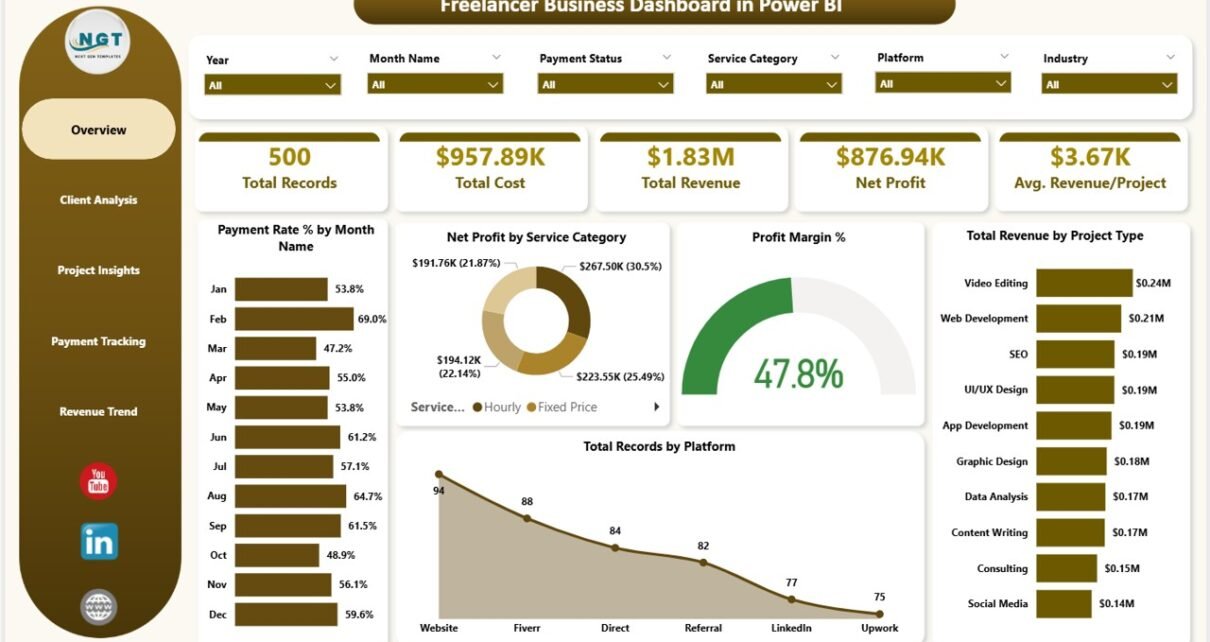 - Advanced Slicers and Filters – Filter the entire dashboard instantly by service category, project type, platform, payment status, client name, month, and more for targeted drill-down analysis.