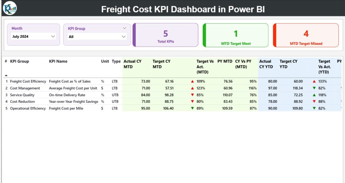 If the Average Freight Cost per Shipment is $120 this month against a target of $100, the dashboard immediately shows a red down arrow (▼) under MTD Icon — signaling that cost control is below the desired level.