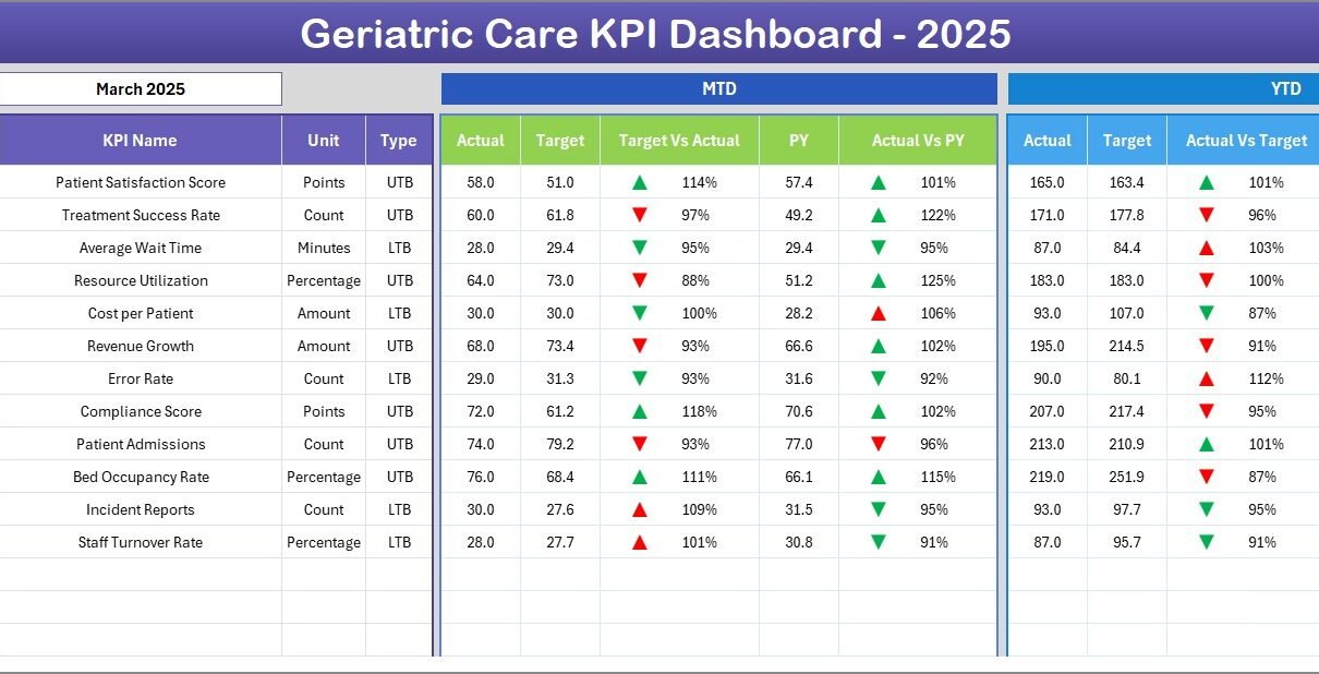 - Customizable: Easily adaptable to different geriatric care settings and KPI requirements.