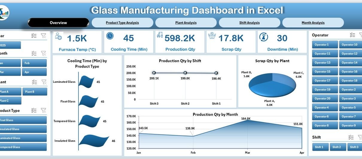 A Glass Manufacturing Dashboard in Excel plays a powerful role in modern production environments. It gives clear visibility into every step—melting, forming, cooling, and packing. Because the dashboard highlights production quantities, energy use, downtime, furnace temperature, scrap levels, shift patterns, and monthly trends, manufacturers make faster and smarter decisions.