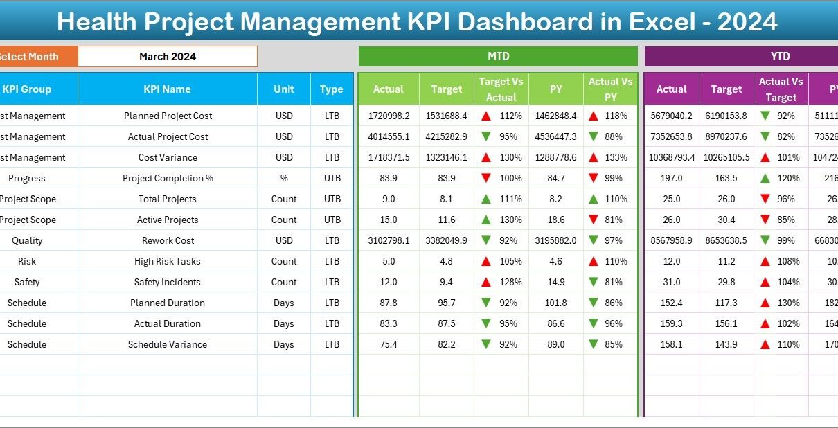 A Health Project Management KPI Dashboard is an Excel-based tool used to track, analyze, and visualize healthcare project performance using key metrics.