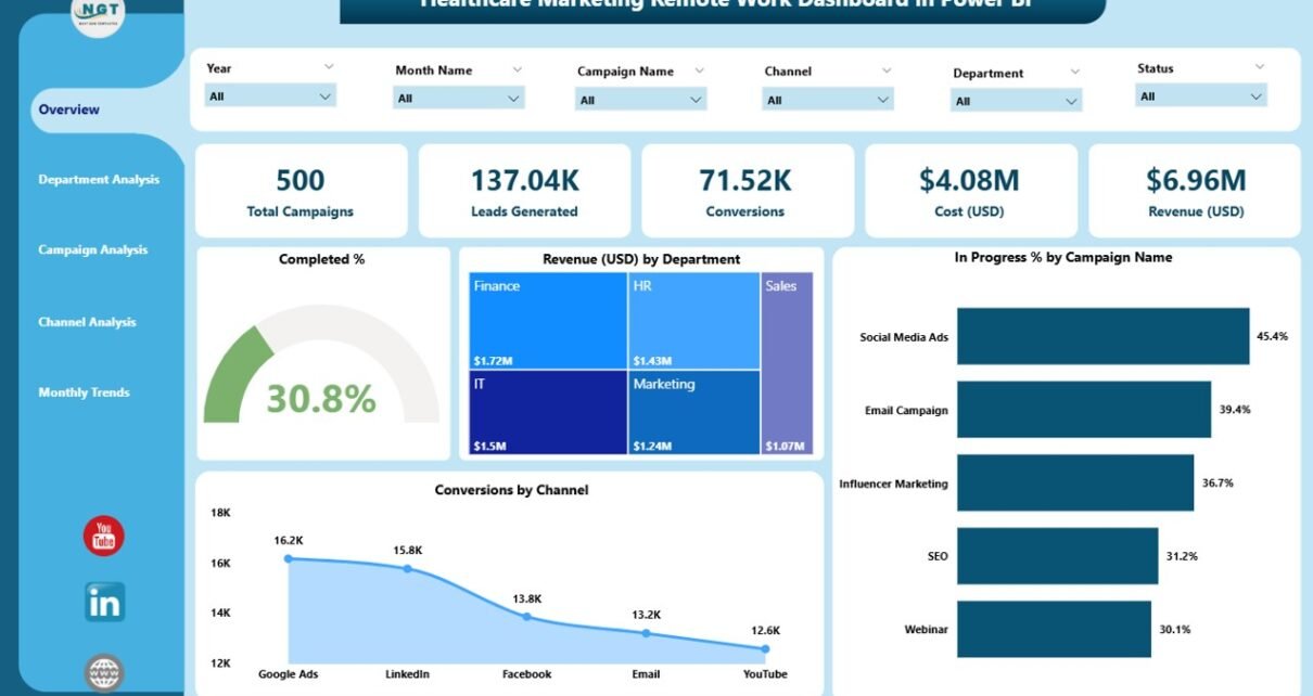 In the modern era, healthcare organizations are rapidly transforming the way they plan, execute, and analyze their marketing operations. As remote work becomes increasingly common, managing marketing performance and team collaboration from different locations has become a major challenge. To overcome this, the Healthcare Marketing Remote Work Dashboard in Power BI offers an intelligent, visual, and data-driven solution.