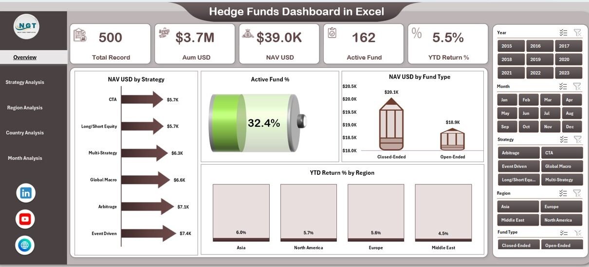 This ready-to-use Hedge Funds Dashboard in Excel includes five analytical pages, a page navigator, and a supporting data structure. Each page focuses on a specific dimension of hedge fund performance.