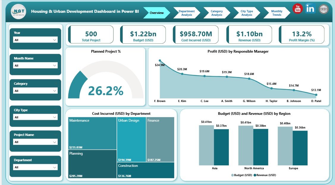A Housing & Urban Development Dashboard in Power BI is an interactive tool designed to visualize and analyze data related to housing projects, budgets, profits, and urban development trends. It converts raw housing and municipal project data into easy-to-understand visuals that help planners, managers, and policymakers track performance efficiently.