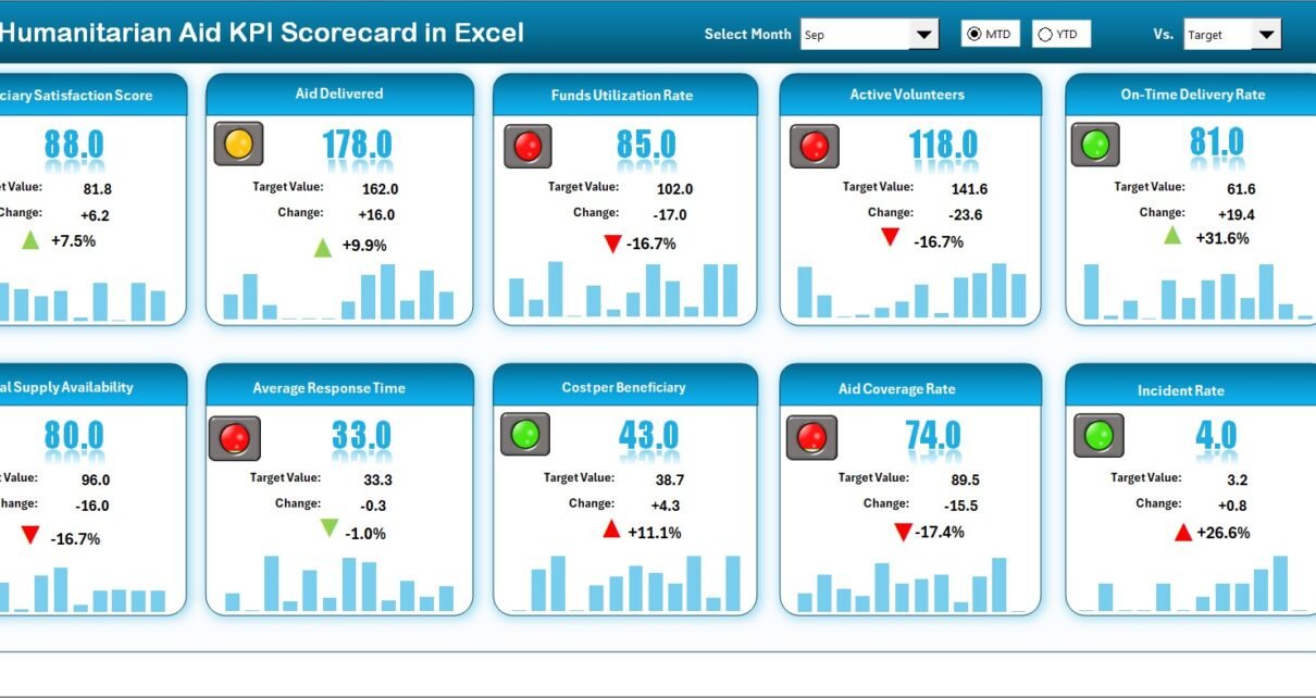 The Humanitarian Aid KPI Scorecard in Excel provides:
