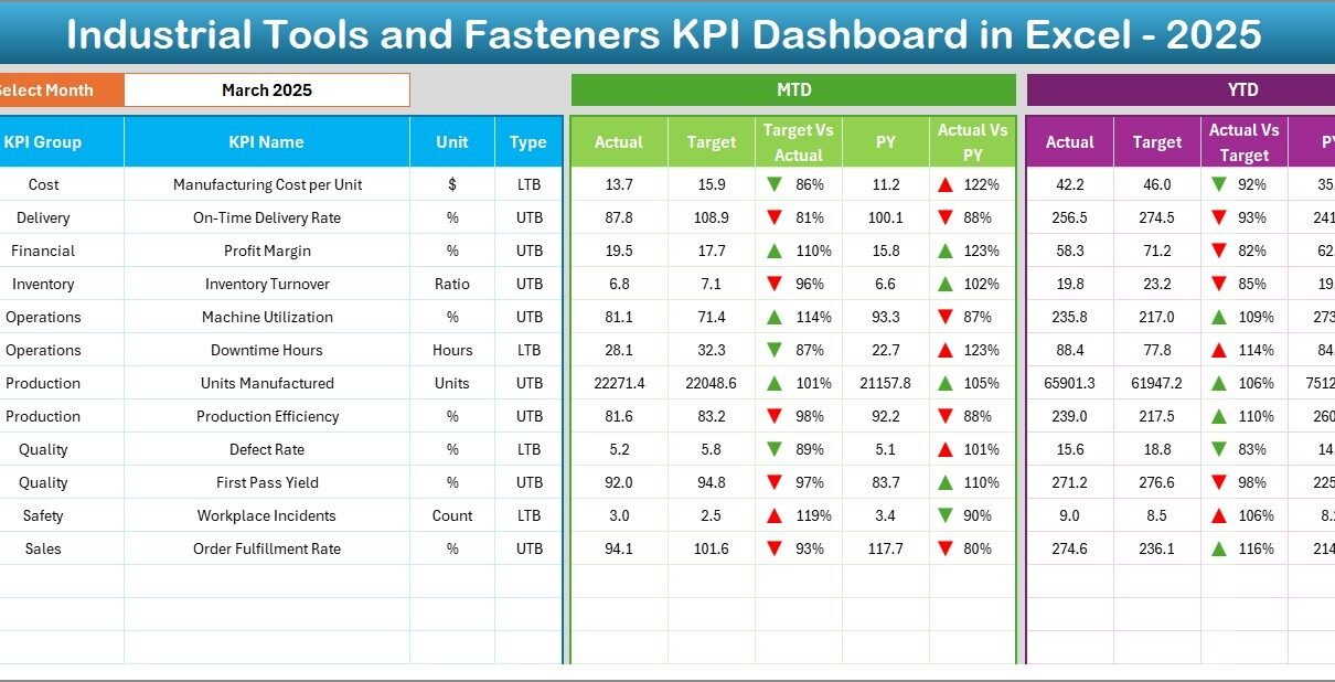 An Industrial Tools and Fasteners KPI Dashboard in Excel is an interactive performance monitoring tool that helps manufacturing companies measure operational success using Key Performance Indicators (KPIs).