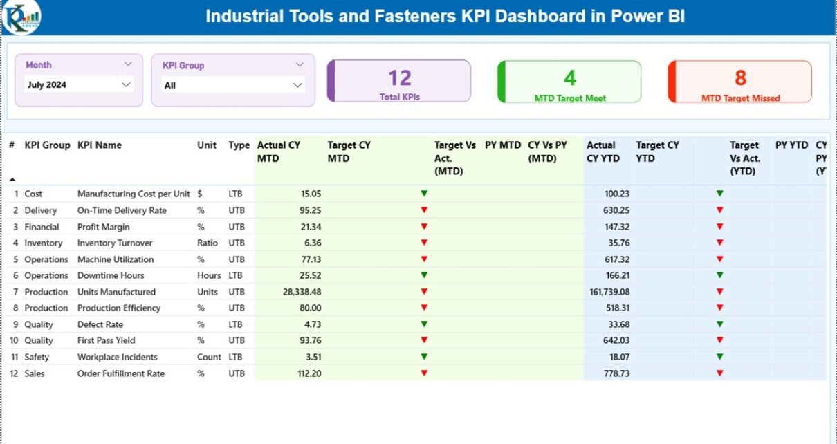 An Industrial Tools and Fasteners KPI Dashboard in Power BI is an interactive business intelligence solution that helps manufacturers monitor operational performance using measurable KPIs.