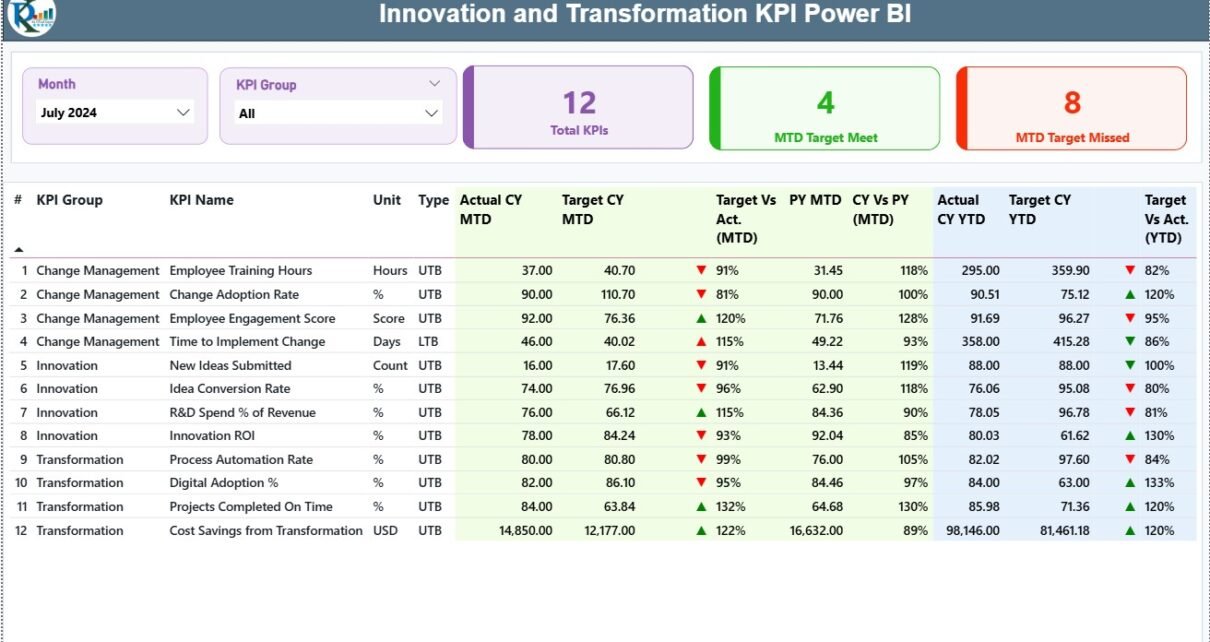 The Innovation and Transformation KPI Dashboard in Power BI is a must-have tool for any organization aiming to measure creativity, digital progress, and strategic transformation.