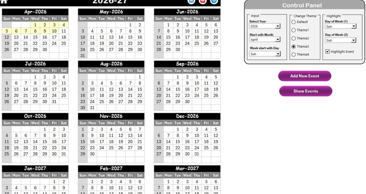 Once selected, the theme applies to the entire workbook. Therefore, you can match the calendar with your brand style.