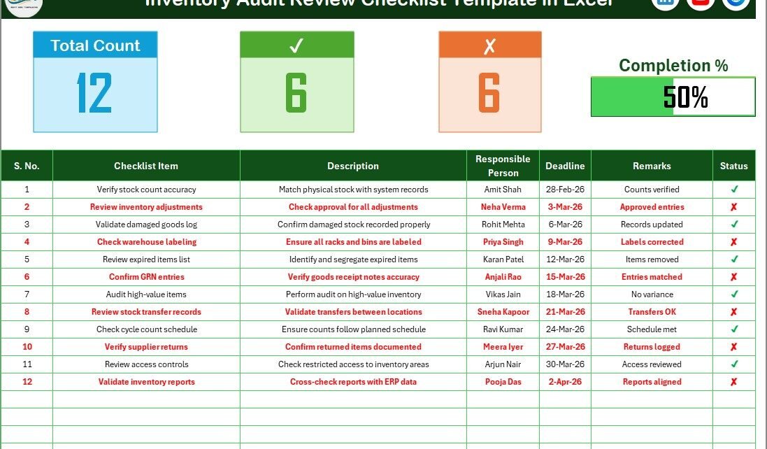 The Inventory Audit Review Checklist in Excel provides a structured and efficient way to manage inventory audits. By combining task tracking, automated progress monitoring, and accountability features, the template simplifies complex audit processes.