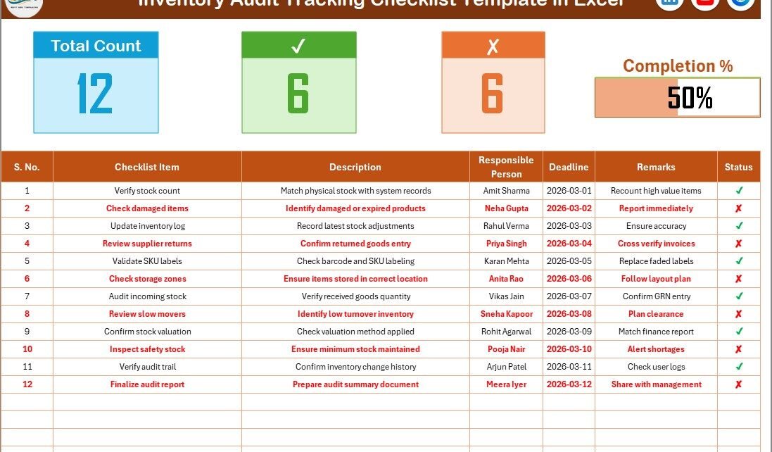 The Inventory Audit Tracking Checklist in Excel provides a simple yet powerful solution. It centralizes tasks, tracks progress visually, and improves accountability across teams.