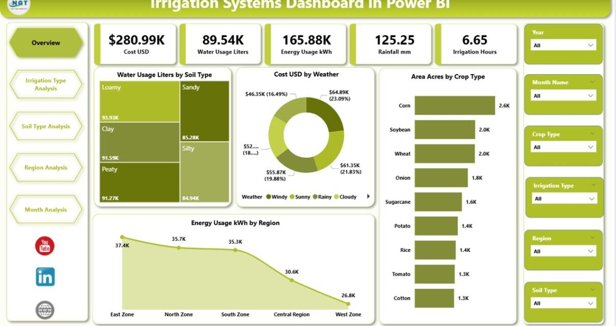 An Irrigation Systems Dashboard in Power BI is a visual and interactive analytics tool designed to track, analyze, and optimize irrigation operations. It transforms raw data related to water usage, irrigation types, soil conditions, energy consumption, costs, and regions into meaningful insights using dynamic charts, KPIs, and slicers.