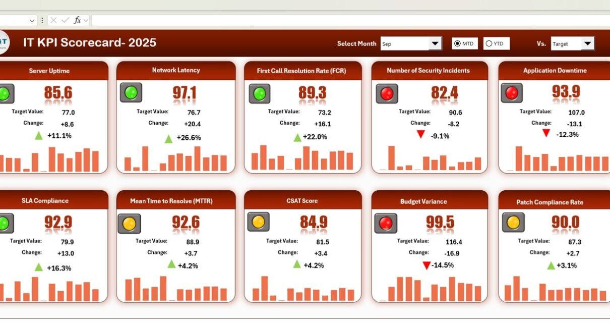 An IT KPI Scorecard is a structured Excel template that tracks multiple IT performance indicators, such as system uptime, incident resolution time, network performance, and service desk efficiency.