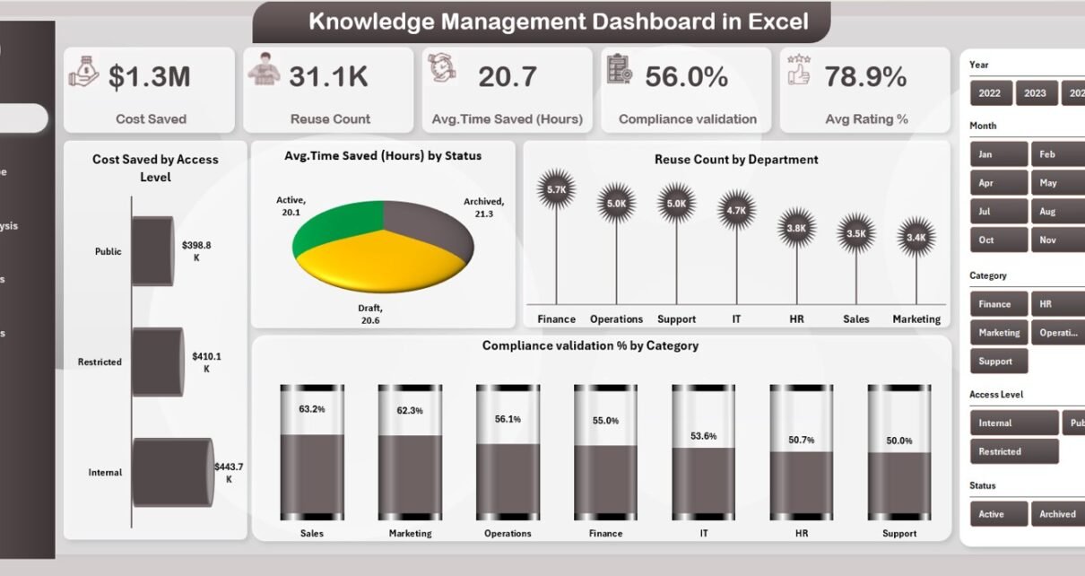 A Knowledge Management Dashboard in Excel is a visual tool that tracks knowledge usage, reuse, cost savings, compliance, and performance metrics in one interactive Excel file.