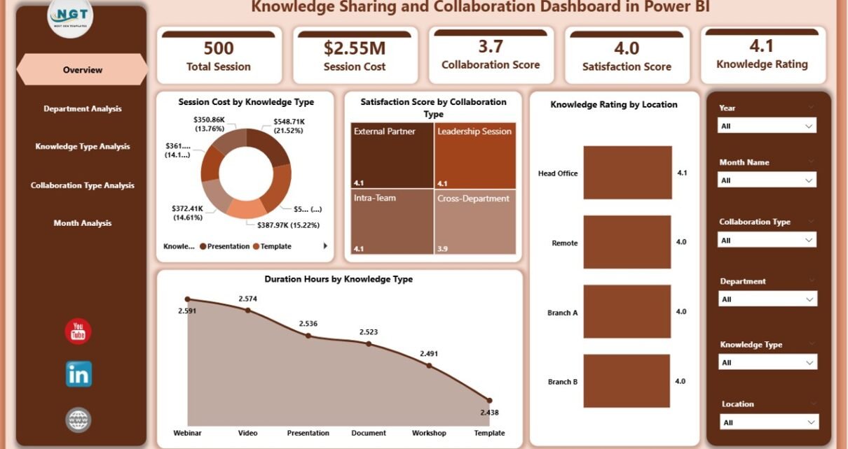 The Knowledge Sharing and Collaboration Dashboard in Power BI transforms scattered data into meaningful insights. It helps track session cost, satisfaction score, knowledge rating, and collaboration effectiveness.