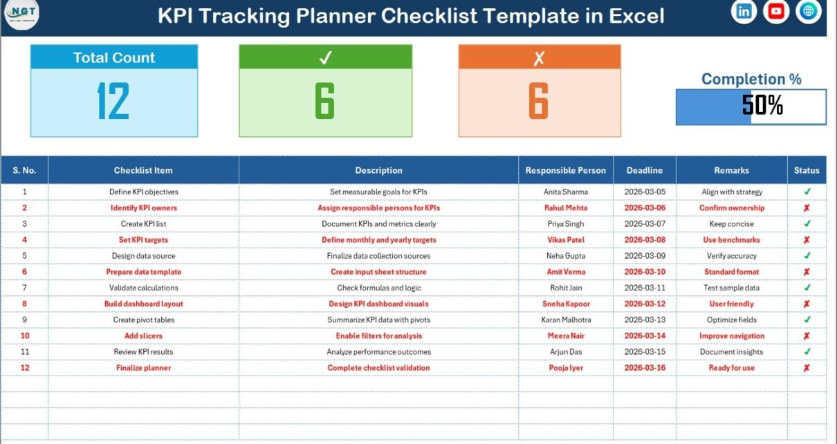 Therefore, a structured planner checklist ensures that every KPI activity receives attention and completion tracking.