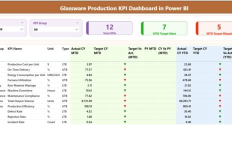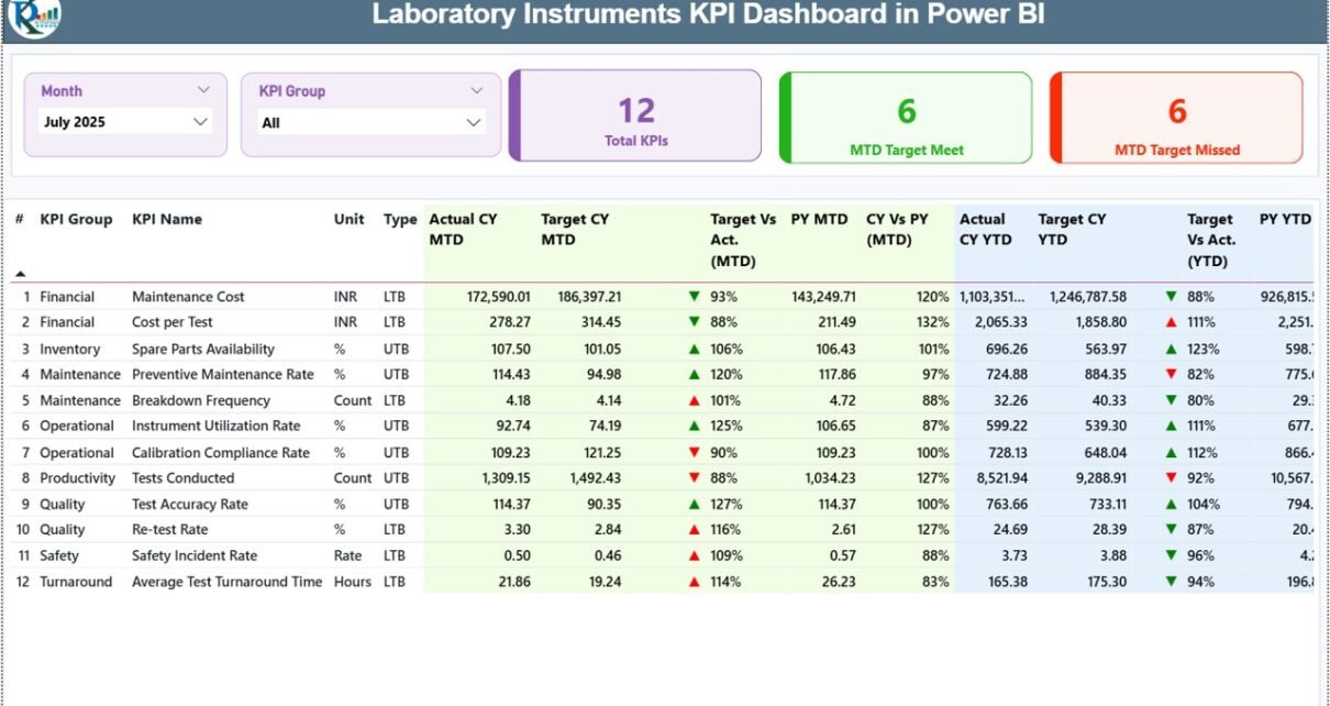 A Laboratory Instruments KPI Dashboard in Power BI is an interactive performance monitoring tool built using Microsoft Power BI. It connects to an Excel file where you enter KPI data. Then, it visualizes performance metrics dynamically.