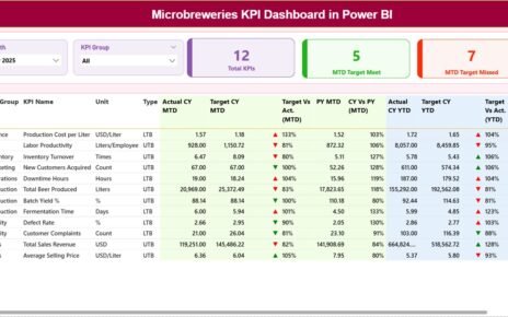 View key metrics such as Month-to-Date (MTD) Actual, Year-to-Date (YTD) Actual, Target, and Previous Year (PY) data.
