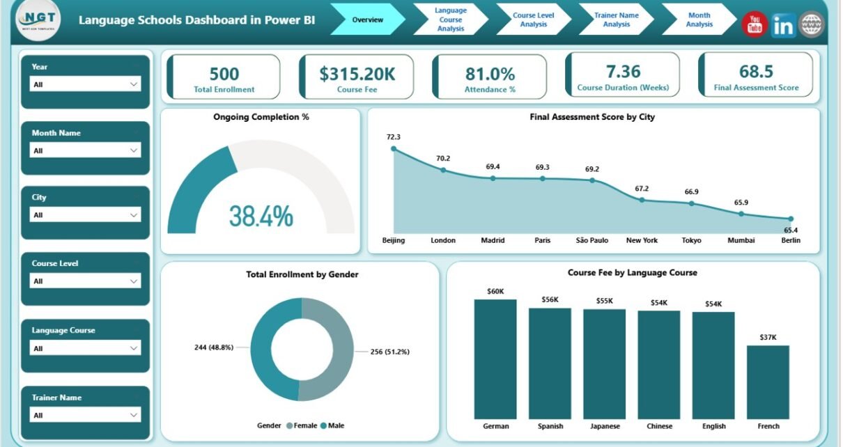 A Language Schools Dashboard in Power BI solves this problem by providing: