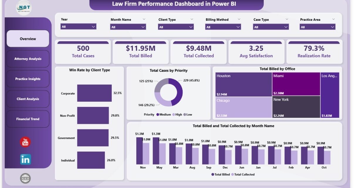 Law Firm Performance Dashboard in Power BI is a ready-to-use business intelligence template designed for law firms, corporate legal departments, and solo practitioners who need complete visibility into billing, collections, attorney performance, and financial trends. This Power BI dashboard includes 5 interactive pages covering every critical dimension of law firm operations. It tracks essential KPIs such as Total Cases, Total Billed, Total Collected, Average Satisfaction Score, and Realization Rate. Built with interactive Power BI visuals and slicers, every chart updates dynamically when you apply filters or connect your own data source.