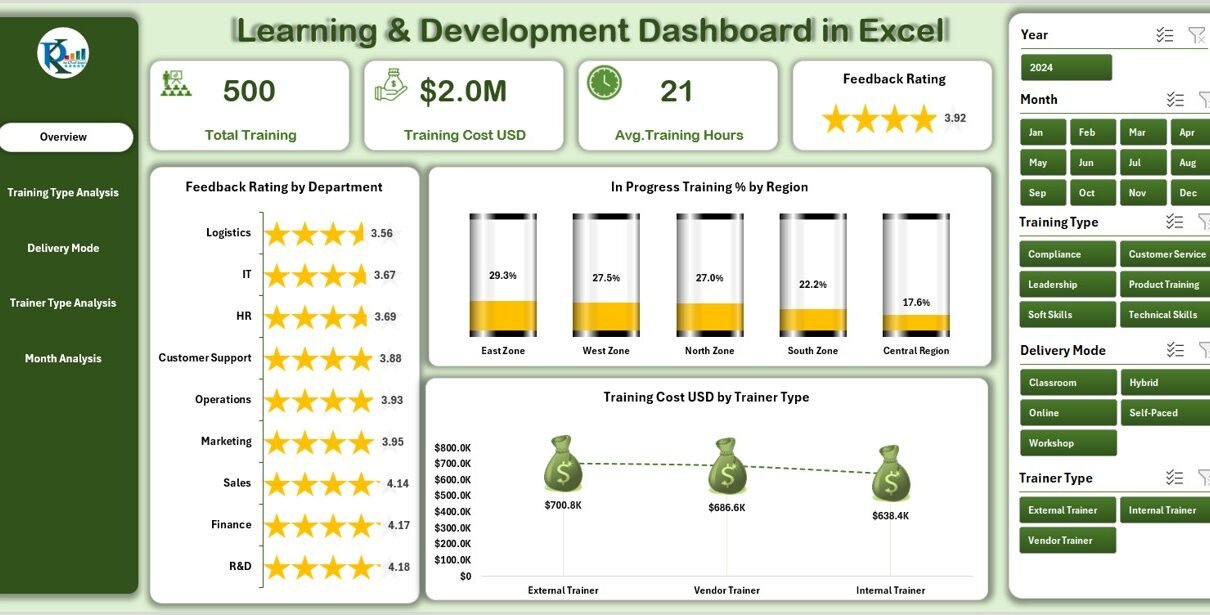 A Learning & Development Dashboard in Excel gives HR teams and leaders a complete picture of employee training activity. It simplifies planning, reduces manual work, improves training quality, and helps you make smarter decisions. With the help of this dashboard, you can track every training program, compare performance across departments, review trainer effectiveness, and optimize your training budget.