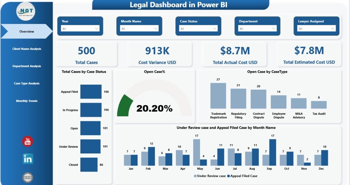 The Overview Page acts as the main control center of the dashboard. It provides a quick snapshot of legal performance.