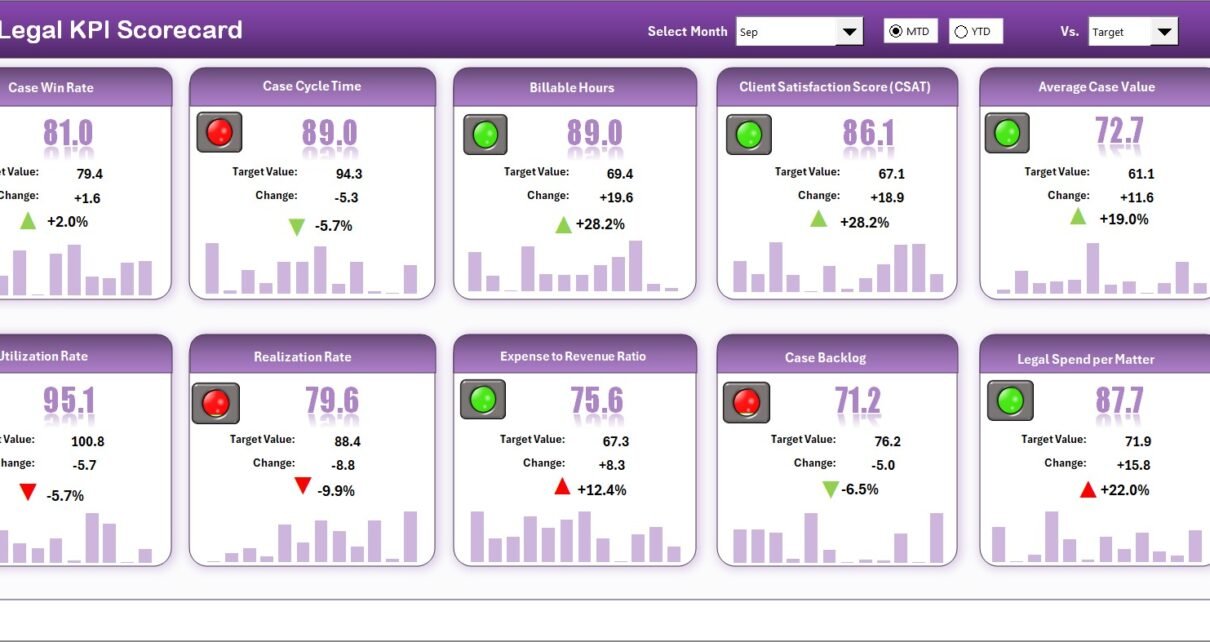 - A Legal KPI Scorecard is an Excel-based tool that tracks performance metrics for legal departments. It compares actual results with targets to measure efficiency and effectiveness.