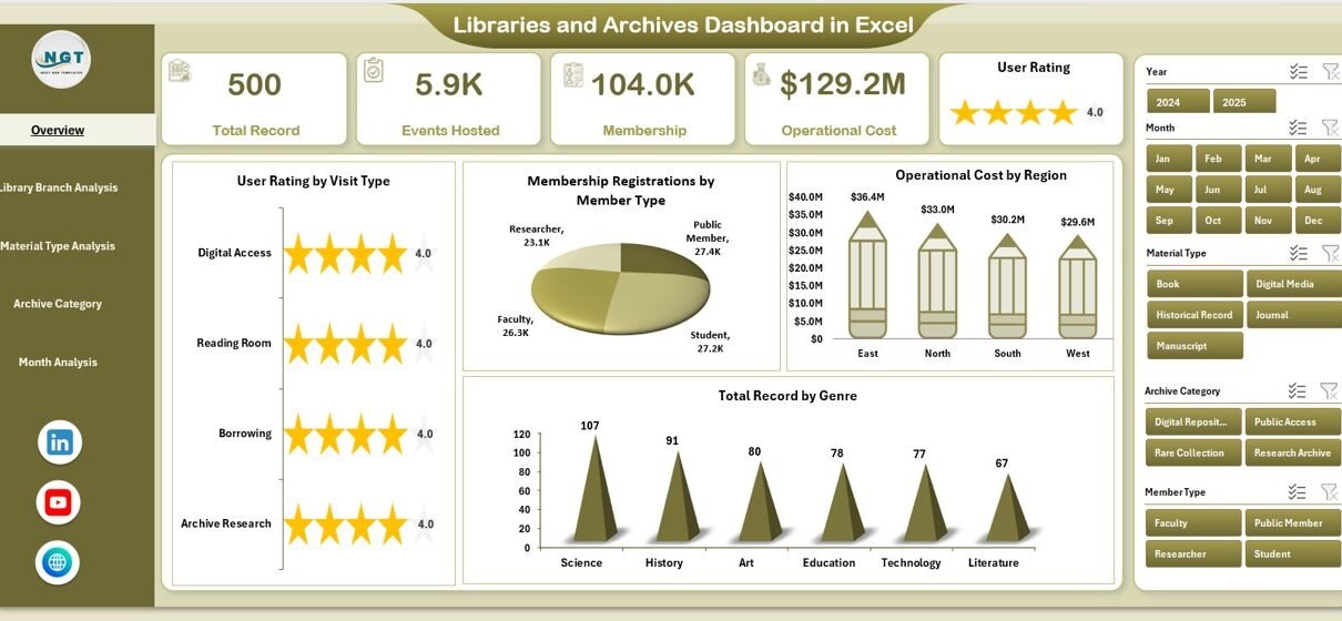 The Libraries and Archives Dashboard in Excel provides a practical and powerful solution for tracking memberships, operating costs, user satisfaction, archive collections, and trends within a single interactive environment.