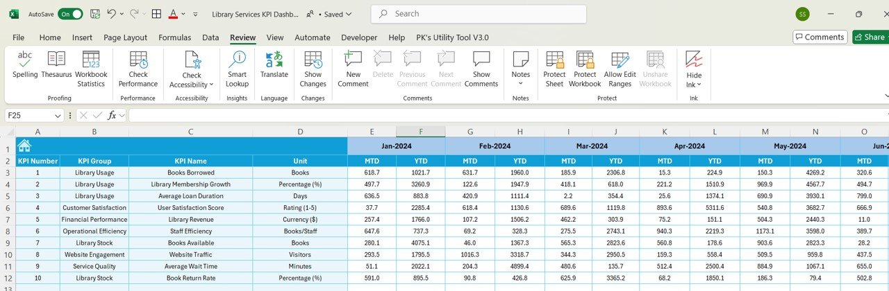 The Library Services KPI Dashboard comes with seven distinct worksheets, each serving a specific purpose to help manage KPIs efficiently: