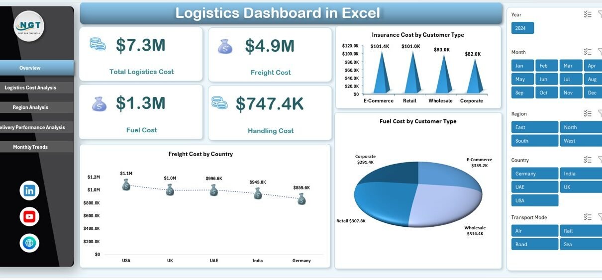 A Logistics Dashboard in Excel provides a practical and powerful solution for managing logistics operations efficiently. Instead of working with scattered spreadsheets, businesses gain centralized visibility into logistics costs, delivery performance, and regional efficiency.