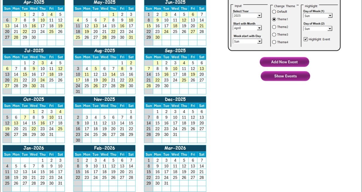 - Enable Highlight Event checkbox to mark event dates in yellow