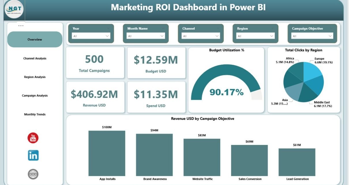 The dashboard calculates KPIs such as budget utilization, ROI, CTR, impressions, clicks, and conversions. After that, interactive slicers allow users to filter data by channel, region, campaign, or time period.
