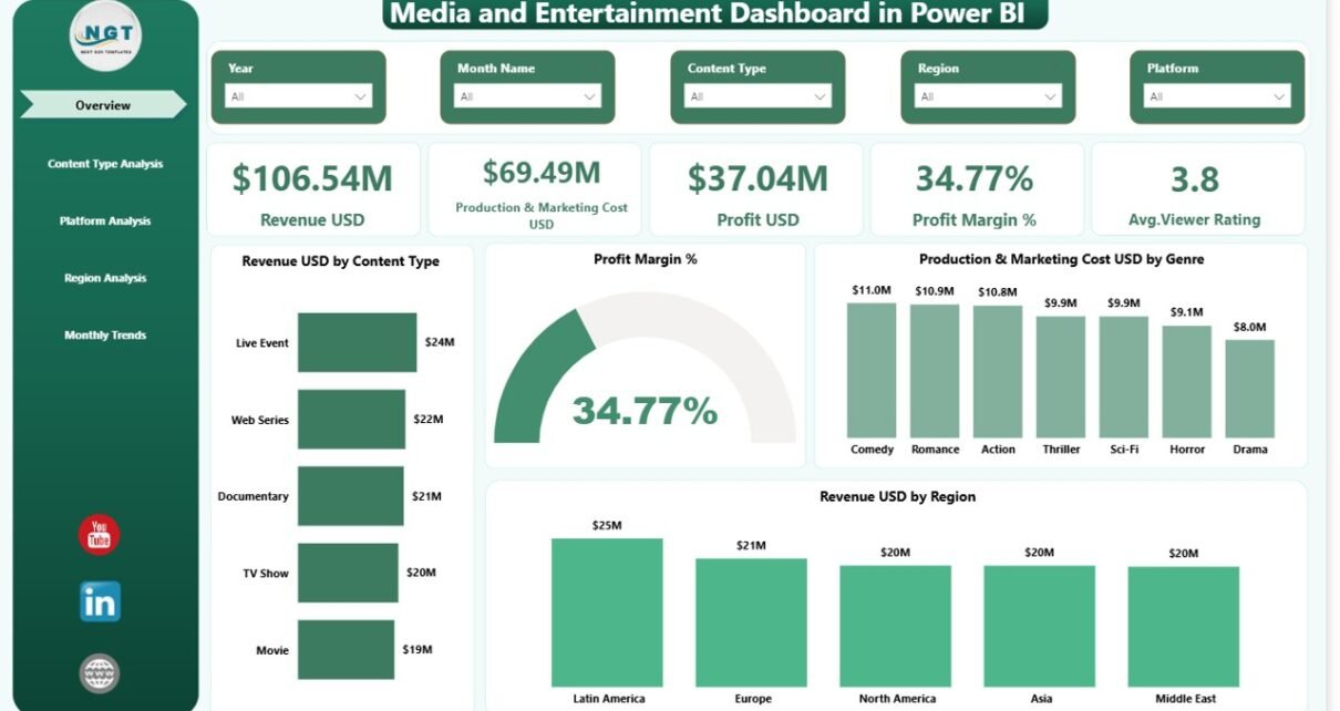 A Media and Entertainment Dashboard in Power BI provides clarity across revenue, cost, profit, ratings, platforms, and regions. Moreover, it simplifies complex data into easy visuals.