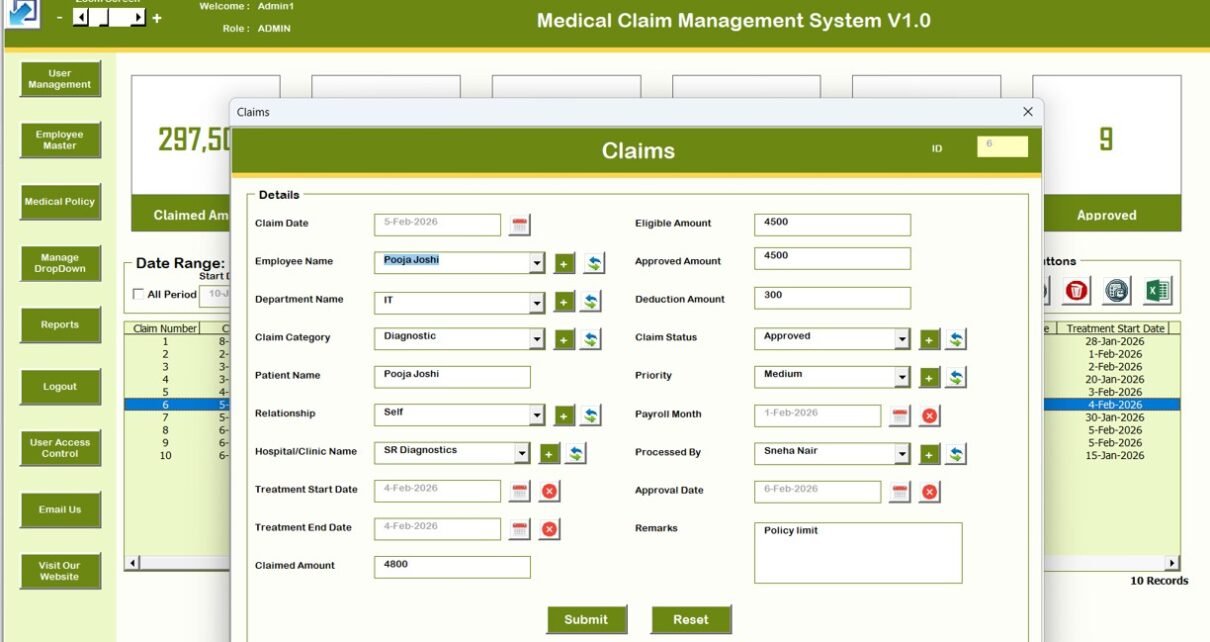 The Medical Claim Management System V1.0 gives you full control over claims, users, policies, and reporting — all inside Microsoft Excel.