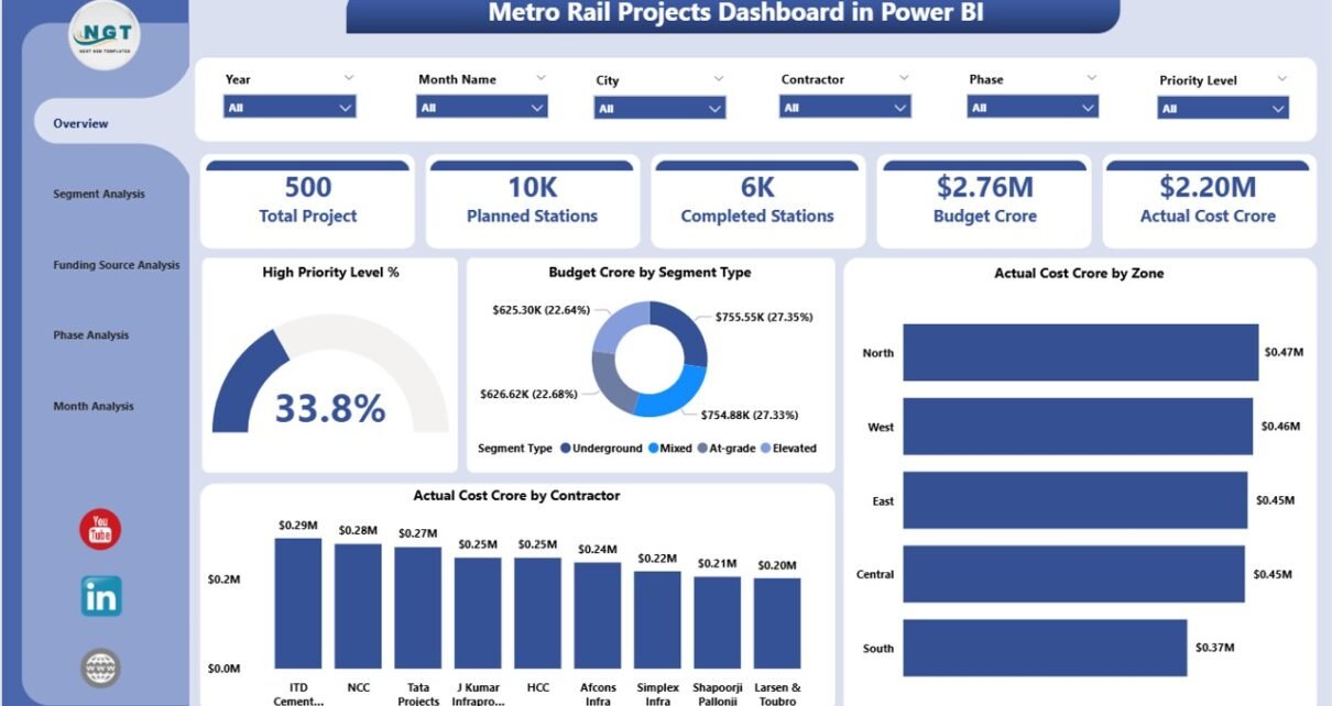 A Metro Rail Projects Dashboard in Power BI is an interactive data visualization and reporting tool designed to monitor, analyze, and control metro rail project performance in a single platform.