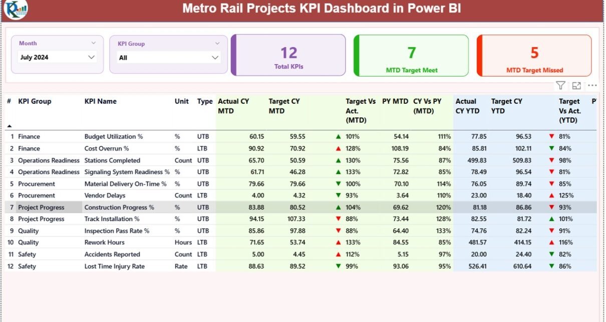A Metro Rail Projects KPI Dashboard in Power BI is a ready-to-use analytical solution designed to monitor key performance indicators related to metro rail planning, construction, execution, and operations.