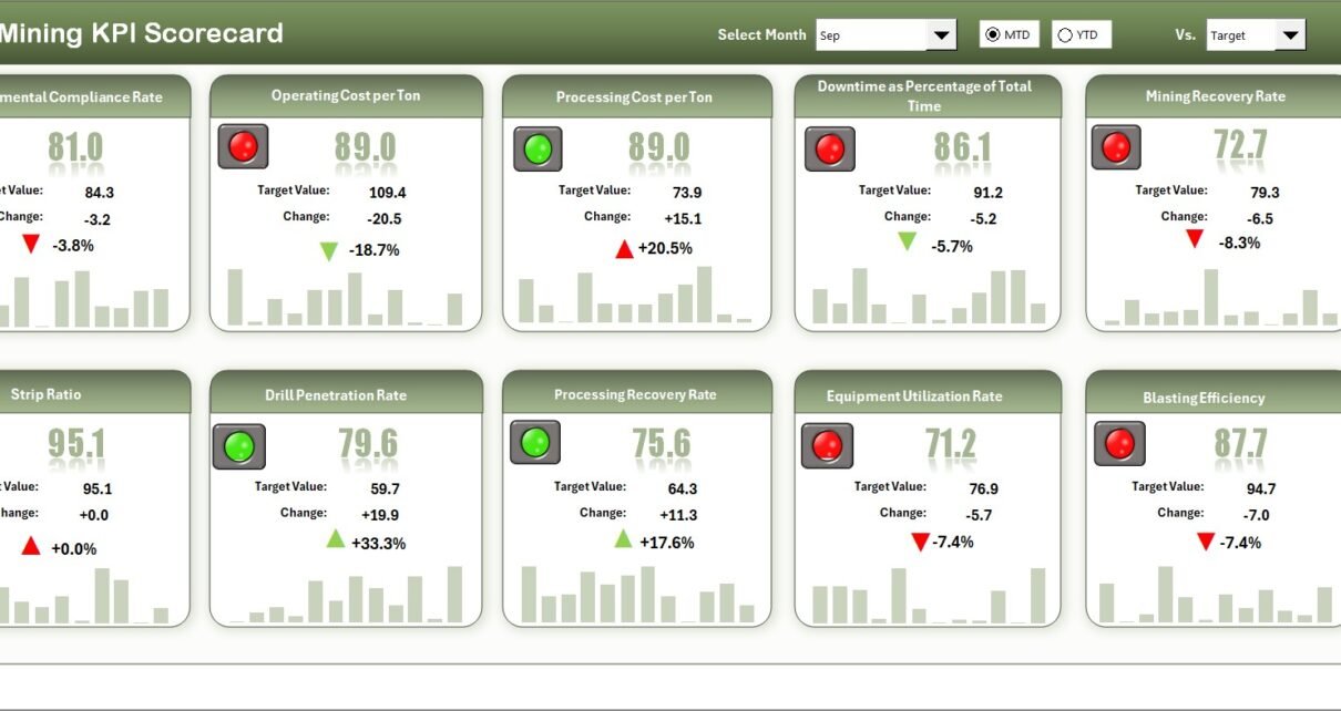 Yes. The dropdown feature allows switching between Month-to-Date and Year-to-Date views, giving you a comprehensive performance perspective.Mining kip scorecard in Excel