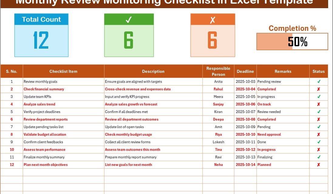 Instead of scattered notes or unorganized spreadsheets, this Excel-based checklist gives you a clear view of what has been completed, what’s pending, and who is responsible for each activity. It acts as your digital review assistant, allowing you to plan, assess, and improve monthly performance in one place.
