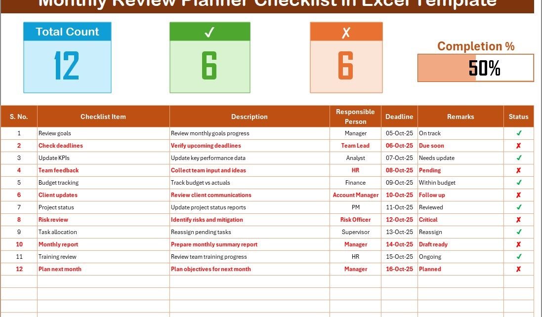 A Monthly Review Planner Checklist in Excel is a structured template designed to track tasks, responsibilities, and deadlines on a monthly basis. It works like a digital planner, giving you a clear overview of what’s completed, what’s pending, and what needs immediate attention.