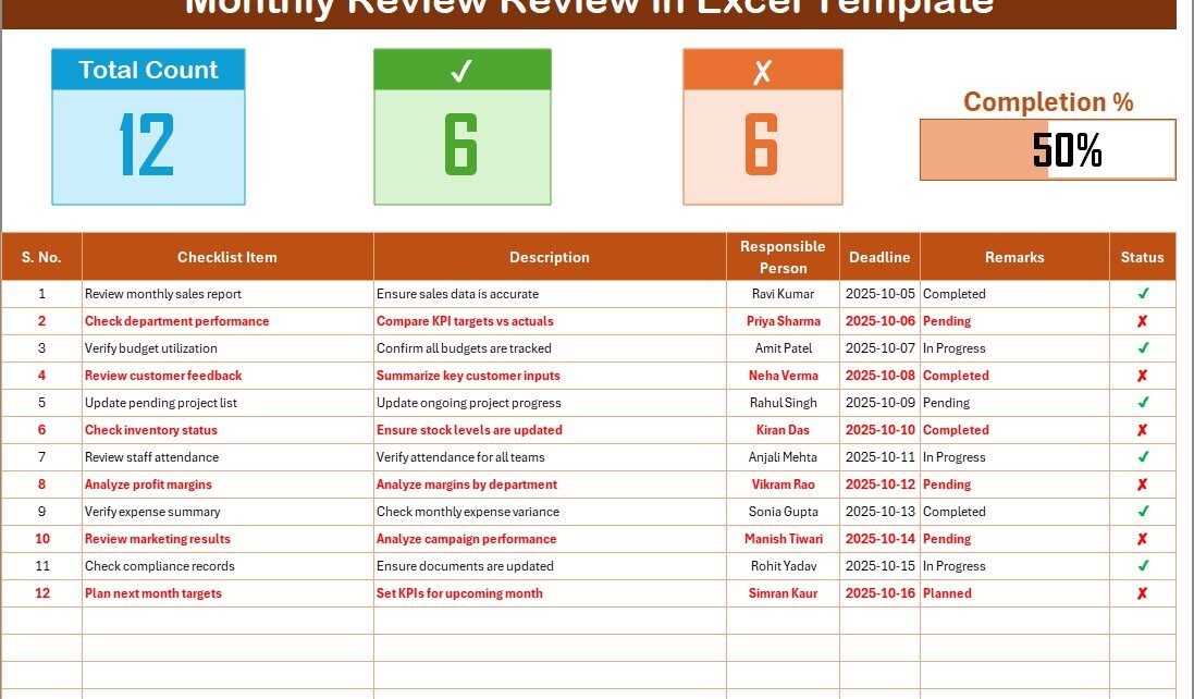 A Monthly Review Checklist in Excel is not just a document — it’s a productivity system that keeps your workflow transparent, goal-oriented, and measurable. It ensures that tasks are completed on time, responsibilities remain clear, and every month ends with a structured evaluation.