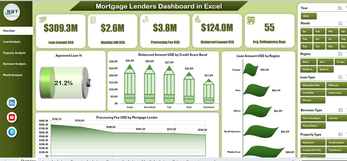 The Overview Page acts as the command center of the Mortgage Lenders Dashboard in Excel.