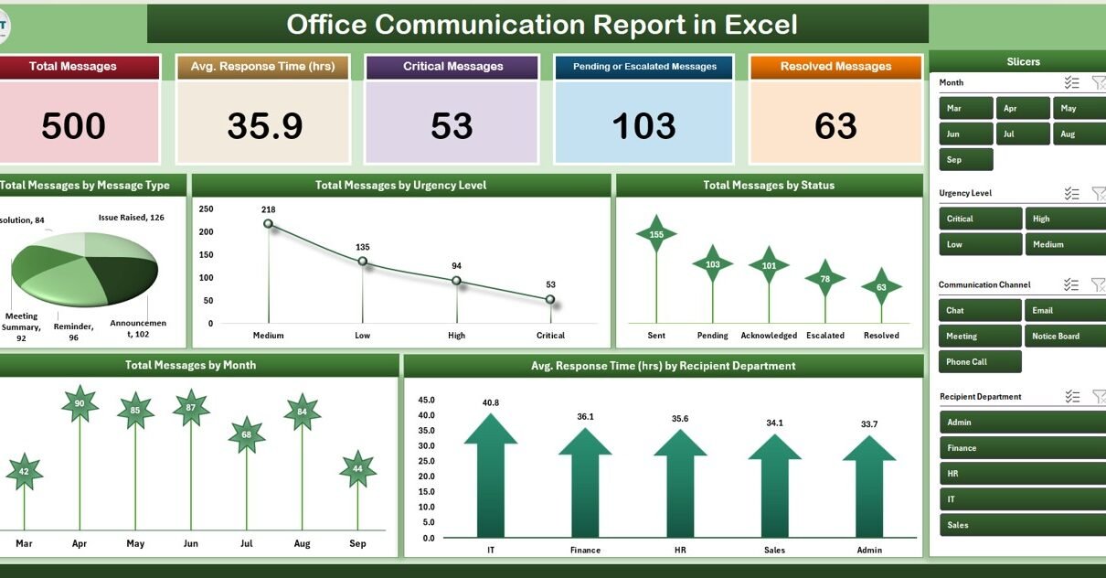 An Office Communication Report is an Excel-based reporting tool that captures and visualizes internal messaging data. It tracks the number of messages, response times, message status, and urgency levels. By using this report, organizations can identify communication bottlenecks, improve response efficiency, and ensure timely resolution of critical messages.