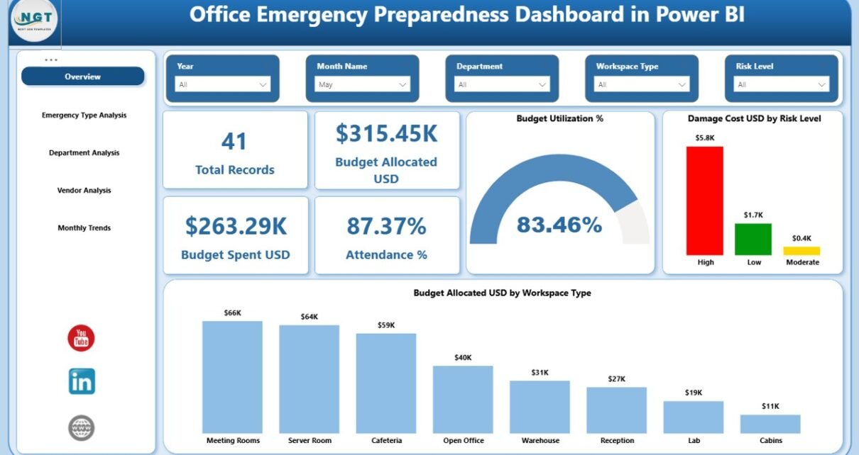 An Office Emergency Preparedness Dashboard in Power BI is a structured analytics solution designed to monitor emergency planning, response drills, safety budgets, and risk assessments across departments and locations.