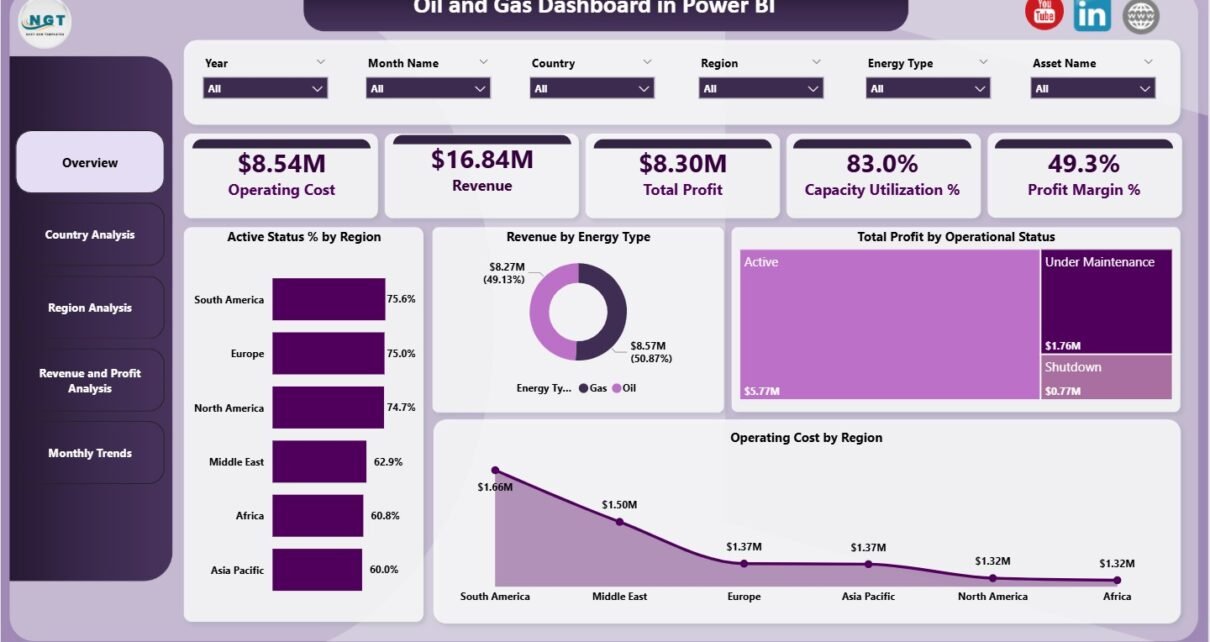 An Oil and Gas Dashboard in Power BI transforms complex industry data into meaningful insights. It helps organizations monitor costs, maximize profit, improve capacity utilization, and track trends across regions and countries.