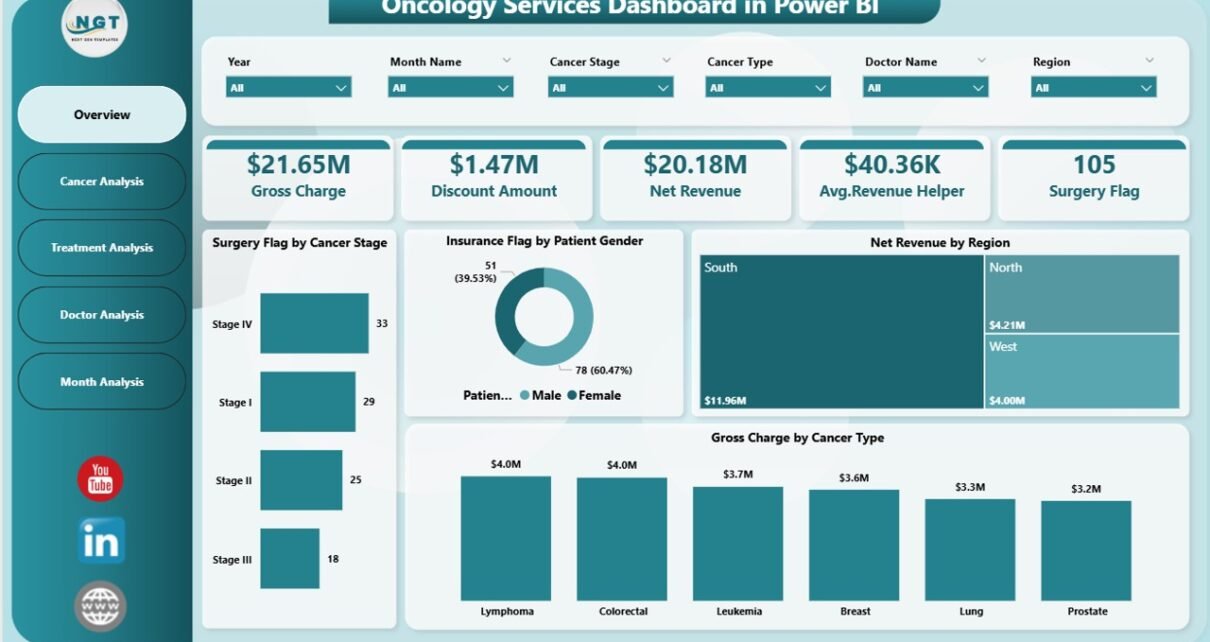 An Oncology Services Dashboard in Power BI transforms complex oncology data into clear, actionable insights. Instead of working blindly, teams gain visibility into cancer performance, treatment efficiency, doctor contribution, and revenue trends.