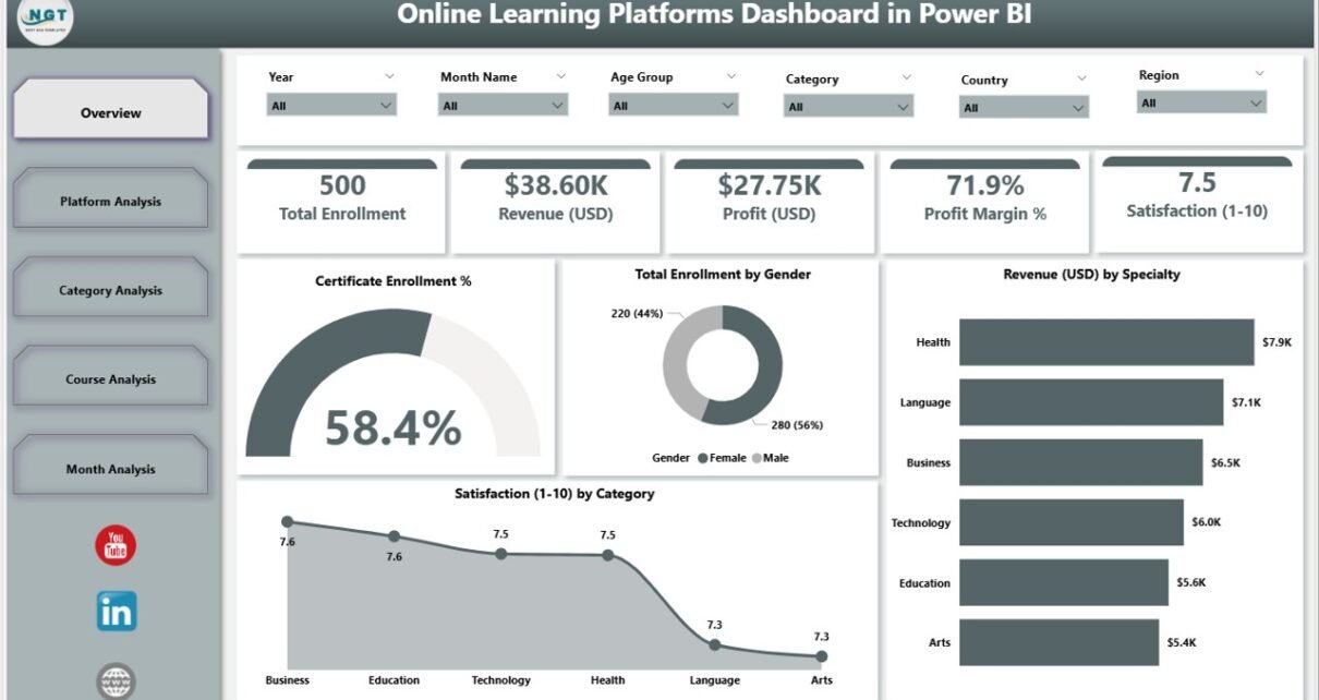 An Online Learning Platforms Dashboard in Power BI organizes all your learning performance data into interactive charts, KPIs, and trends. You can explore enrollment growth, revenue flow, course popularity, learner satisfaction, and category-wise performance within seconds.